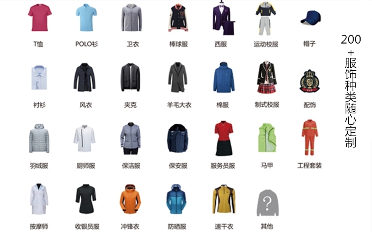 我公司专注于羽绒服、汉服、卫衣、西服、衬衫、职业装、T恤、校服、酒店服装、工装制服、冲锋衣